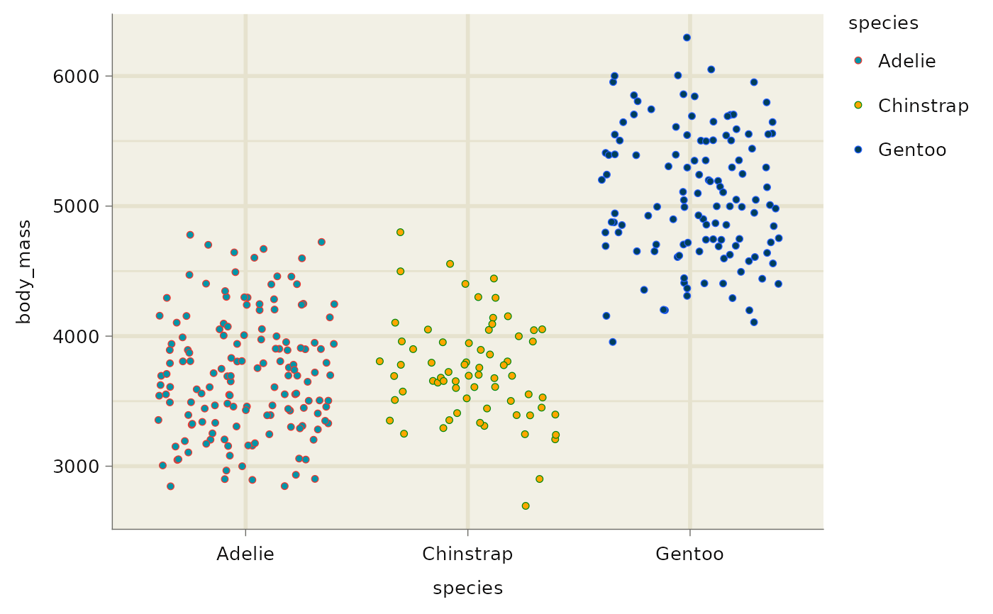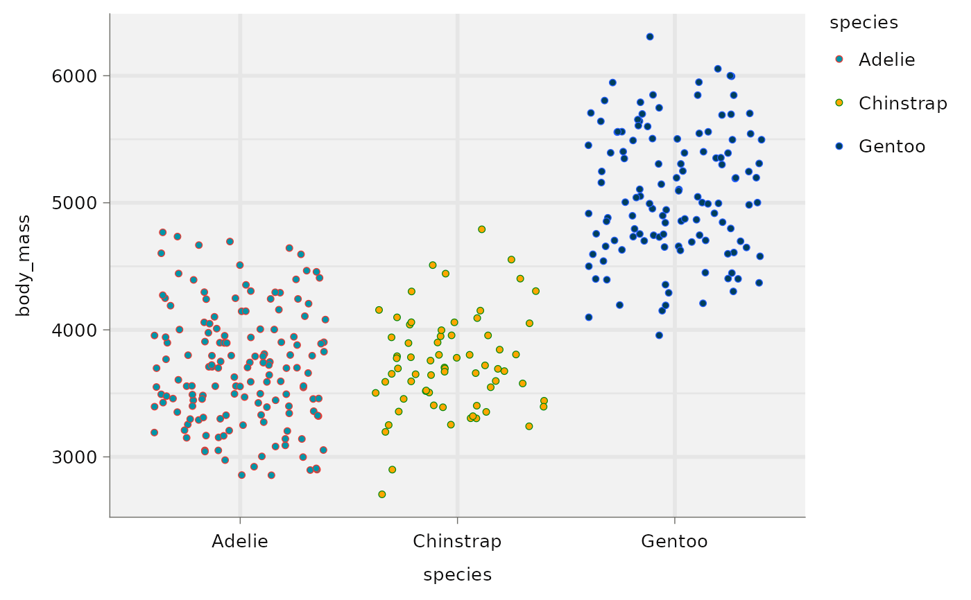 ggplot(aes(x = species, y = body_mass, colour = species, fill = species)) +