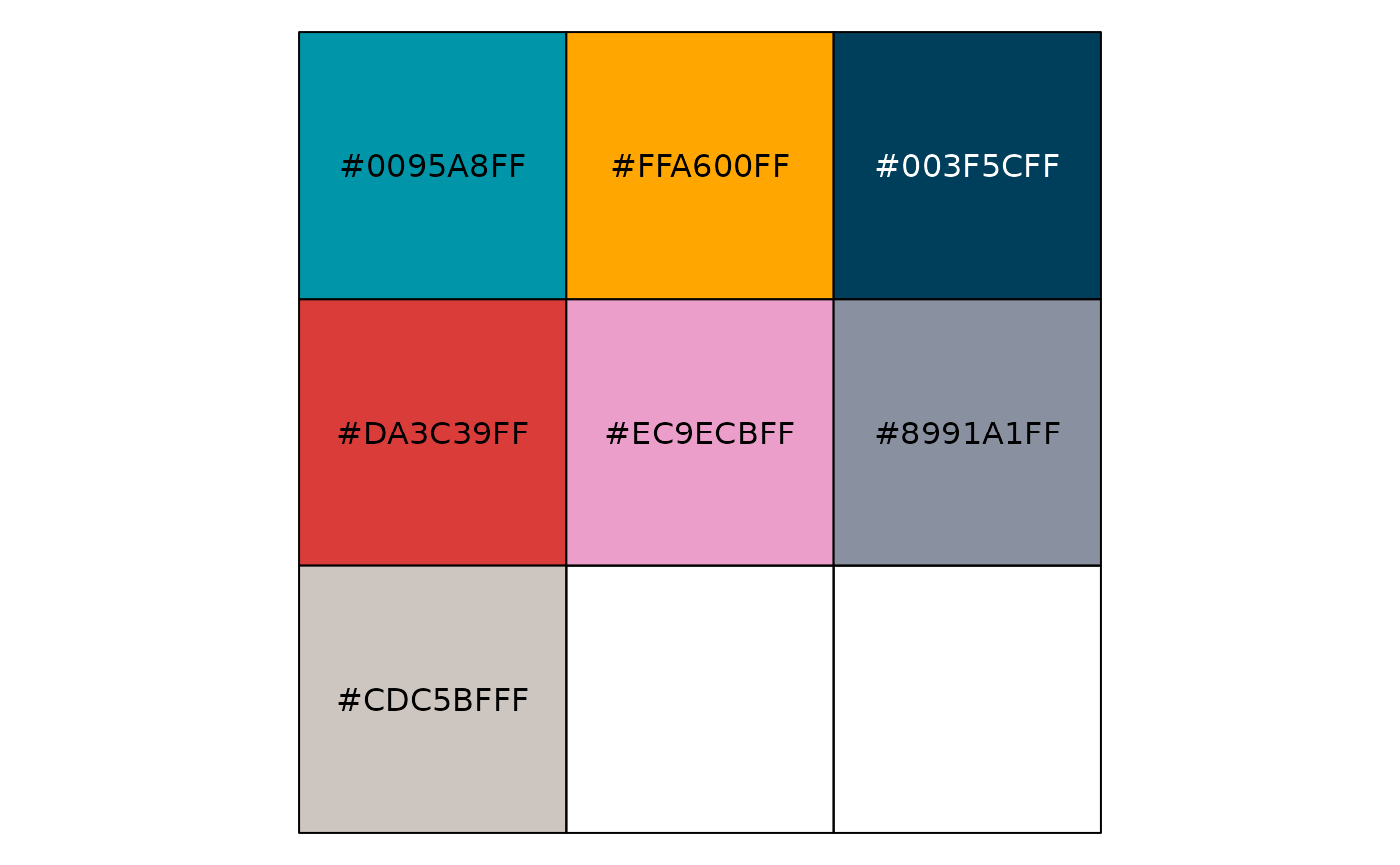 A pretty discrete colour palette that is also relatively colourblind and contrast safe on a light background.